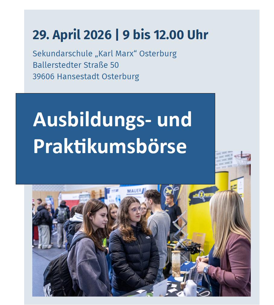 Die hier gemachten Angaben sind freiwillig. Die Daten werden ausschließlich zur Kommunikation im Rahmen der Ausbildungs- und Praktikumsbörse verwendet. Eine Weitergabe an Dritte sowie eine Nutzung im Landkreis Stendal für andere Zwecke wird ausgeschlossen.